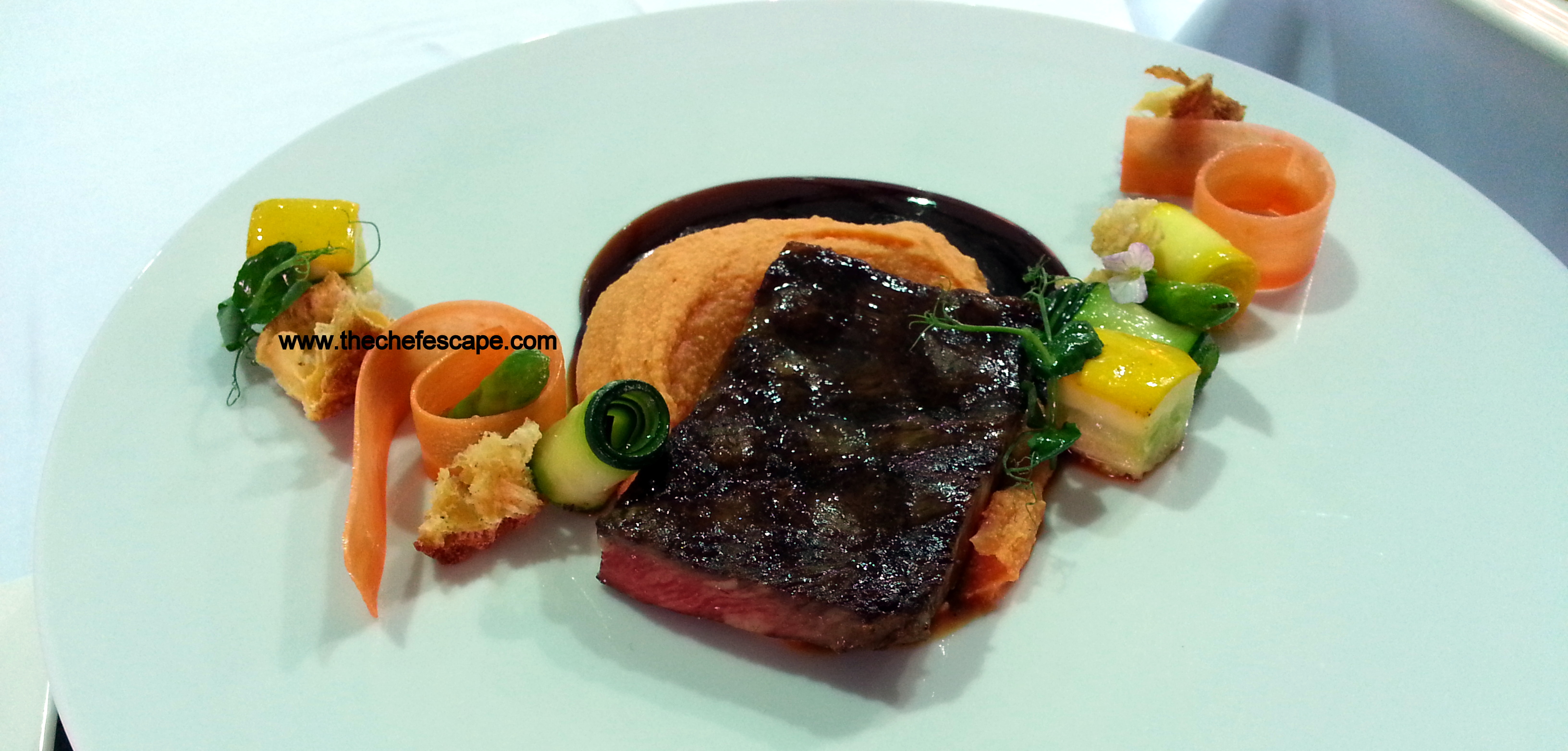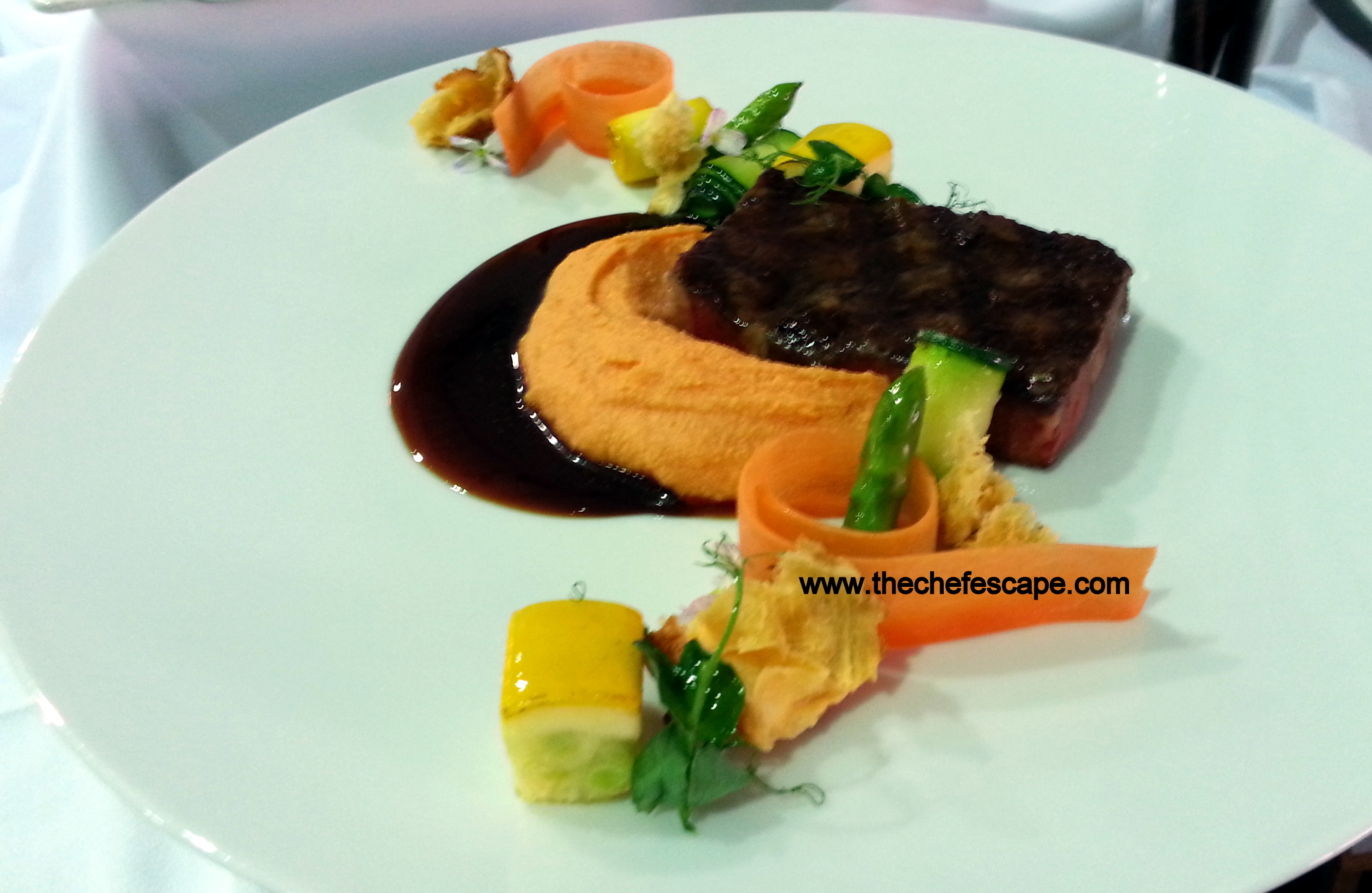 Grilled Rib-Eye with Sweet Potato Puree, Buttered Vegetables,Crispy Yorkshire Pudding and Demiglace